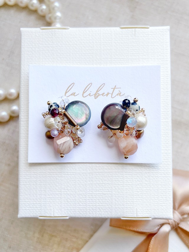 Gems《月華(げっか)》 夜空に浮かぶ月の光が、 そっと花びらを照らすように―― 静かなで優しい輝きを耳もとに添えるデザイン。 ブラックシェルの深い光沢が 角度によって幻想的な虹色を放ち 柔らかなピンクベージュ【オレンジムーンストーン】が 愛らしさを引き立てます。 繊細に散りばめた天然石とパールが まるで月光のように瞬き 上品でロマンチックな印象に仕上げました。 華やかすぎず 日常にも溶け込む上質な輝き。 特別な日にも、 ふとした日常にも、あなたらしい光を纏って。 【こんな方におすすめ】 ・唯一無二のイッテンモノがお好きな方 ・天然石の表情や繊細な輝きを楽しみたい方 ・落ち着きと華やかさを兼ね備えたデザインを求める方 ・やりすぎない遊び心あるデザインがお好きな方 ✧ 自分へのご褒美や、大切な方への贈り物にもおすすめ ┈┈┈┈┈┈┈┈┈┈┈┈┈┈┈┈┈┈┈┈┈ 選択いただける金具について ♢ ステンレスピアス 汗や水に強く、錆びにくい素材です。 ♢ ネジバネ式イヤリング 耳に合わせてサイズを調整いただけます。 シリコンクッション付で痛くなりにくいです。 その他ご希望の金具がございましたら、お気軽にご相談ください。 ┈┈┈┈┈┈┈┈┈┈┈┈┈┈┈┈┈┈┈┈┈ ■素材 金具☞ピアス サージカルステンレス イヤリング ステンレス (イヤリングはネジバネ式) オプションより選択してください。 ガラスビーズ 日本製コットンパール 天然石 ブラックシェル オレンジムーンストーン ダルメシアンジャスパー ラピスラズリ シェル オニキス ジルコン ガーネット ラブラドライト テグス 接着剤 レジン ◾️size 約2.4センチ ◾️重さ 6g(両耳合わせて)