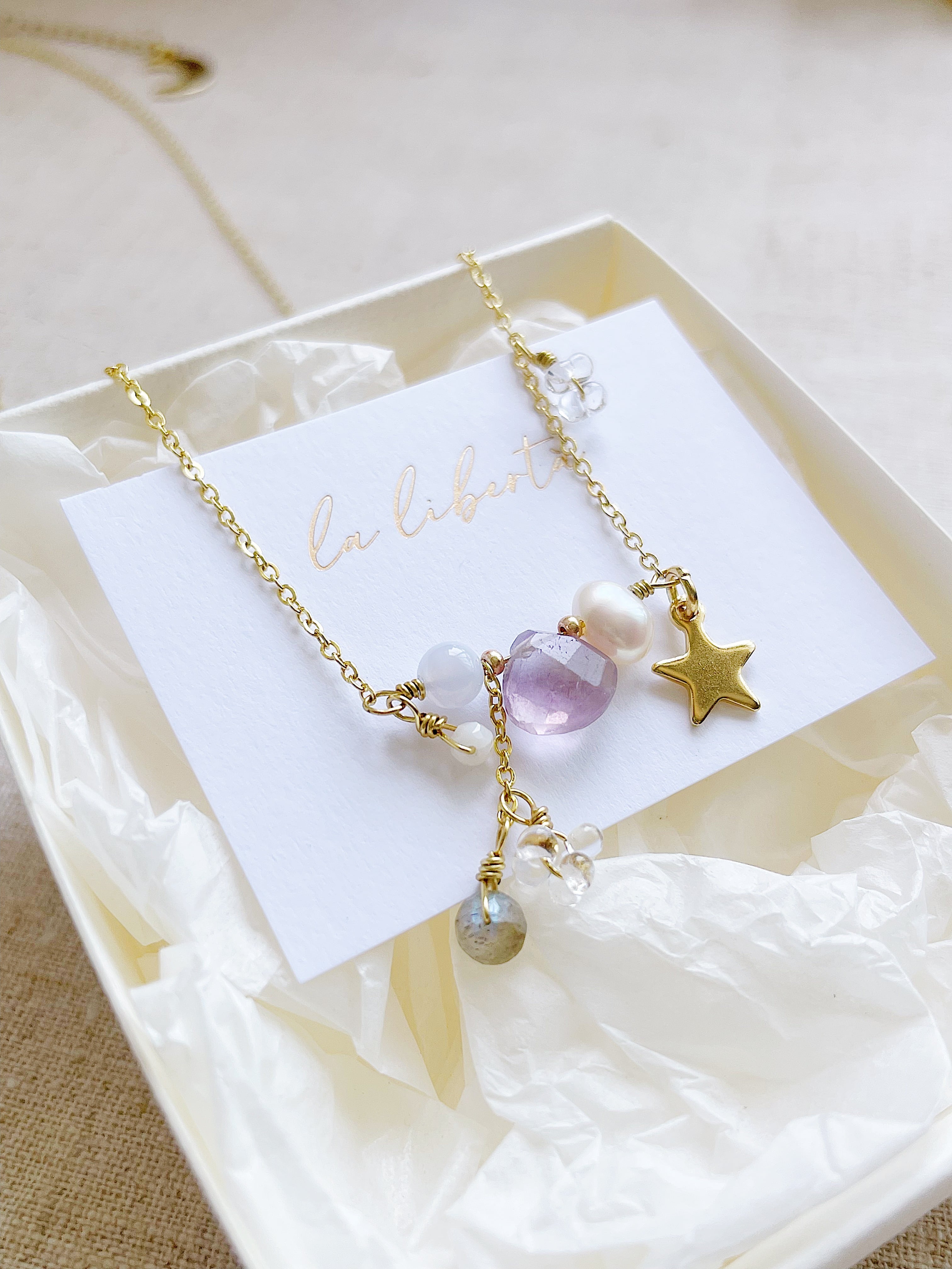 フロントには、ラブラドライトやブルーレースアゲート、小粒の淡水パールが優しく上品に胸元を演出してくれます。