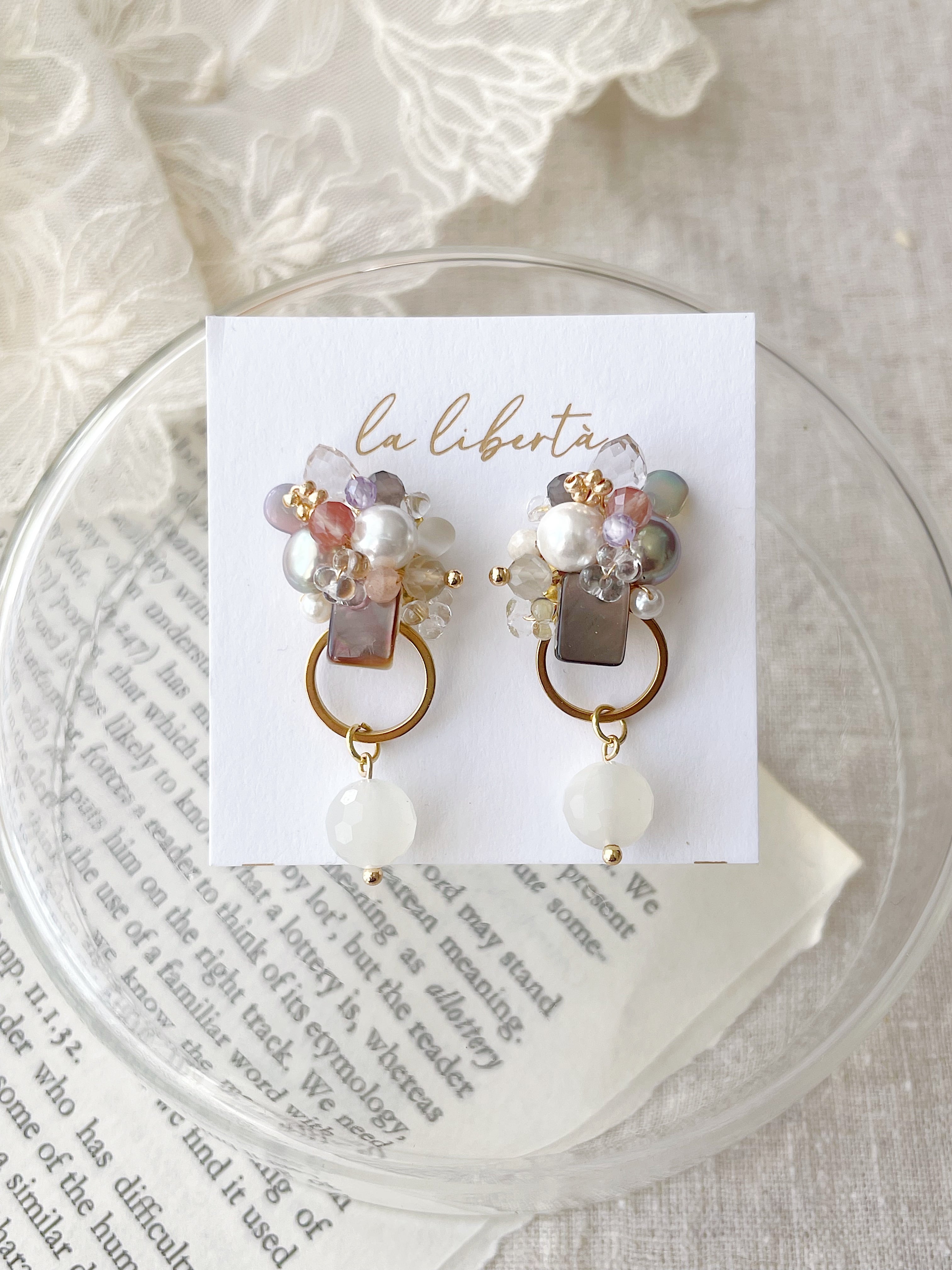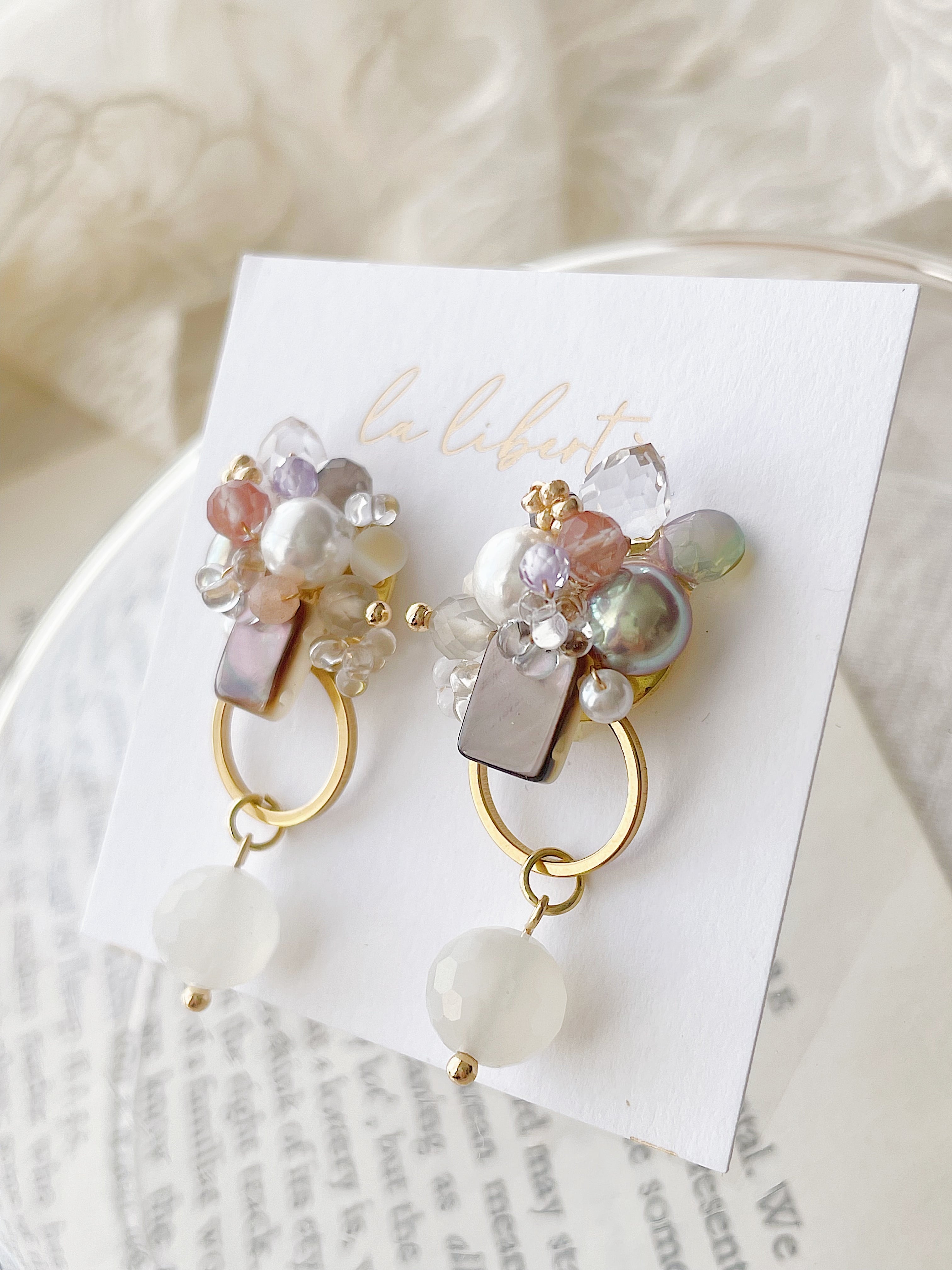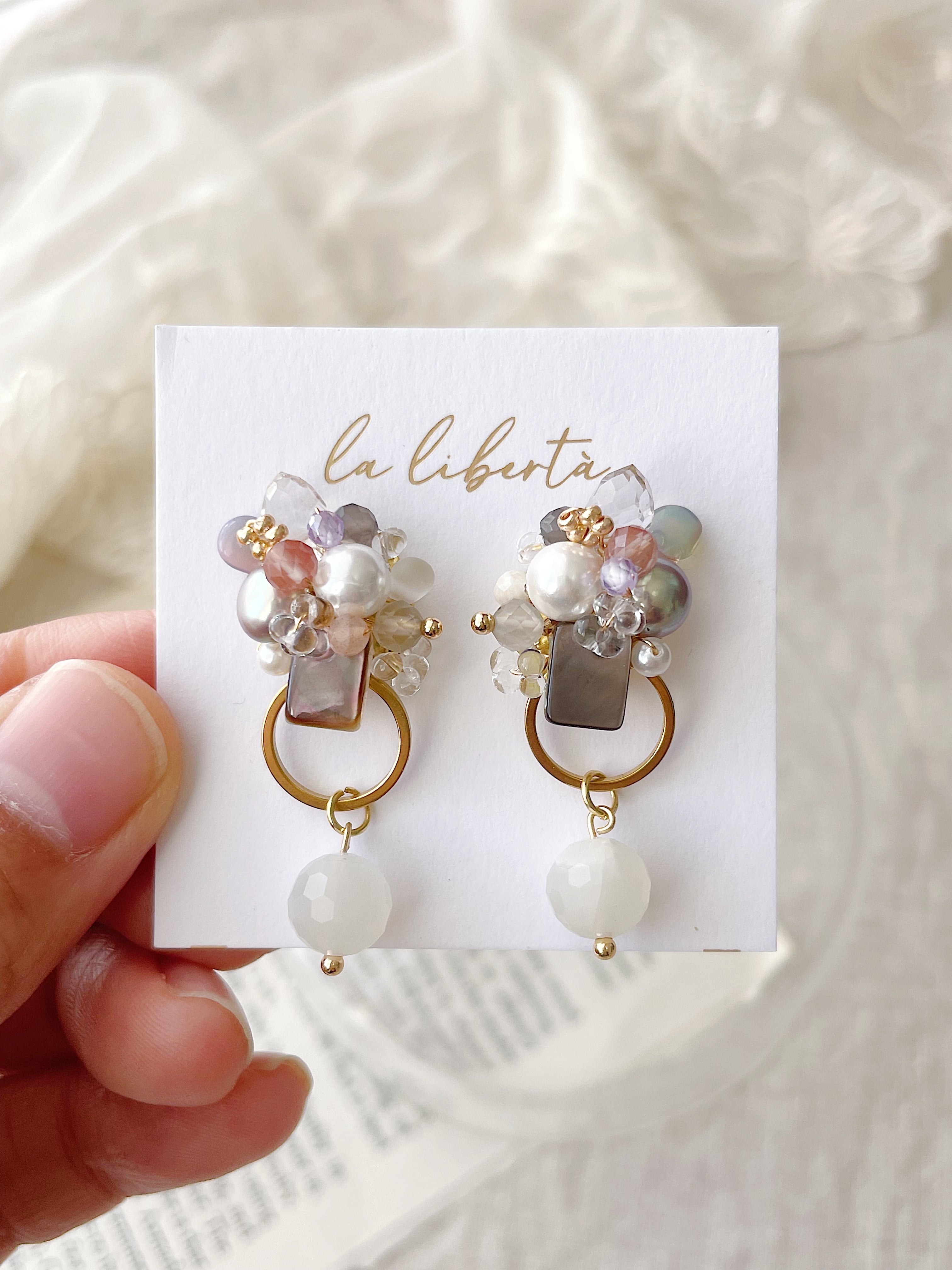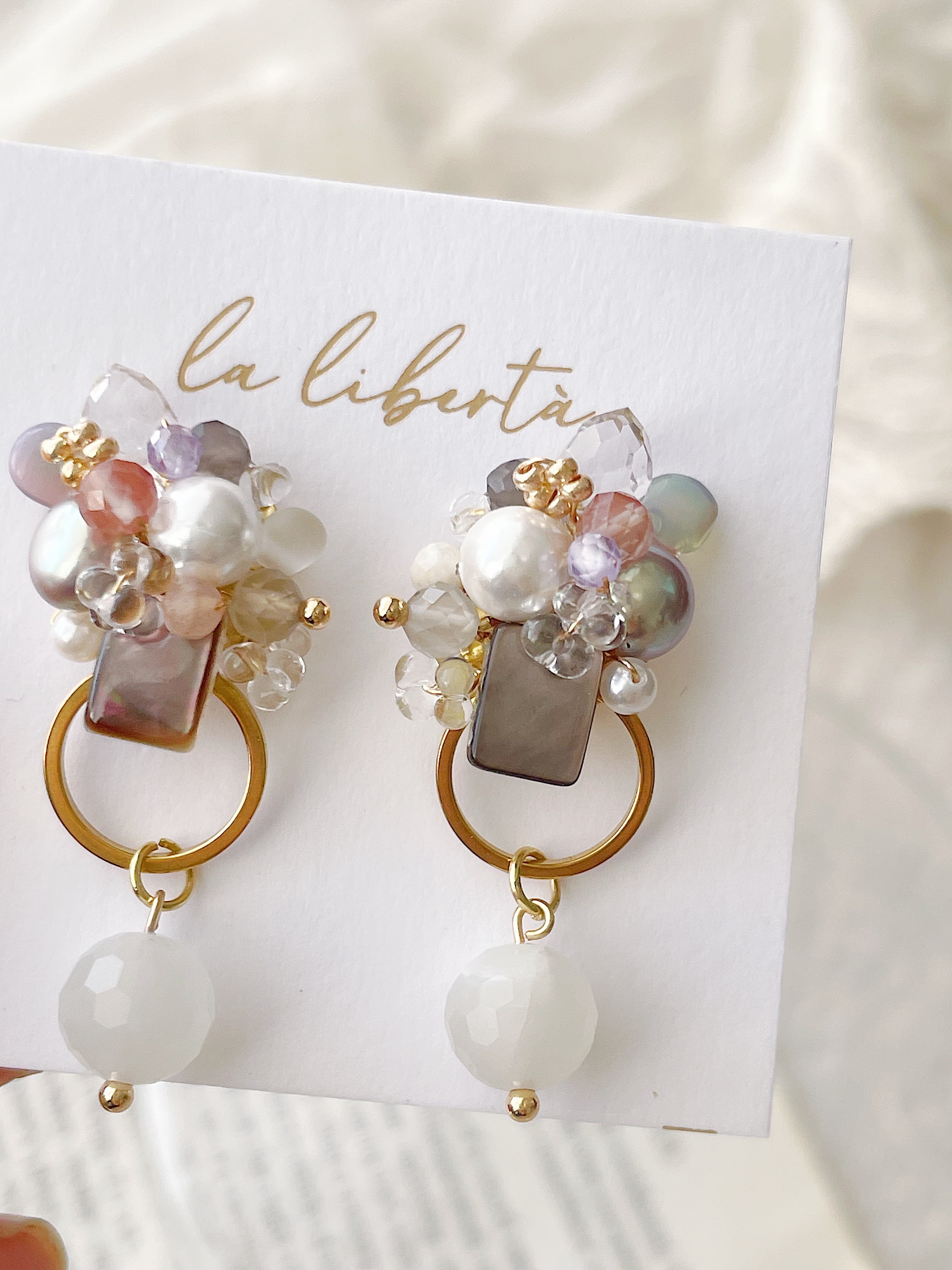 淡い色合いの天然石とパールを丁寧に重ねた、